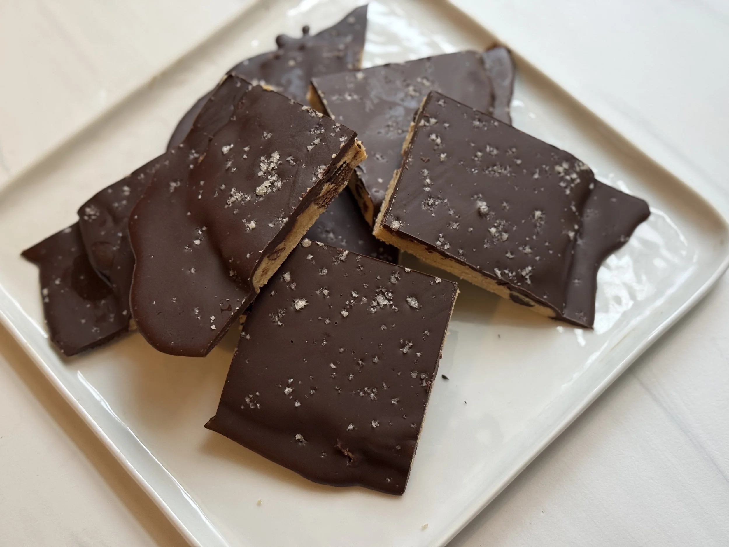 In 30 second increments, melt down the additional chocolate. Fold in the coconut oil and stir until silky smooth. Pour the chocolate all over the cookie dough until it’s fully covered. Sprinkle with flaky salt (or kosher salt), and chill for at least 30-45 minutes. The longer it sets in the fridge, the better. When you’re ready, slice them into squares and serve cold. I recommend that you don’t leave them out for too long as they will soften and get too messy.