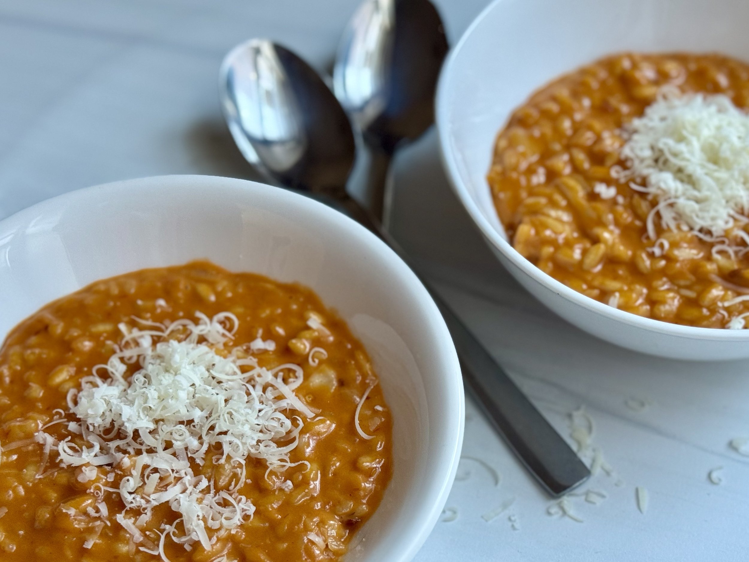 When all the stock is absorbed, add the heavy cream and continue stirring until a beautiful pinkish hue and the rice is tender. Fold in the parmesan cheese, check for seasonings, and add the remaining kosher salt as needed. Serve immediately, and enjoy!
